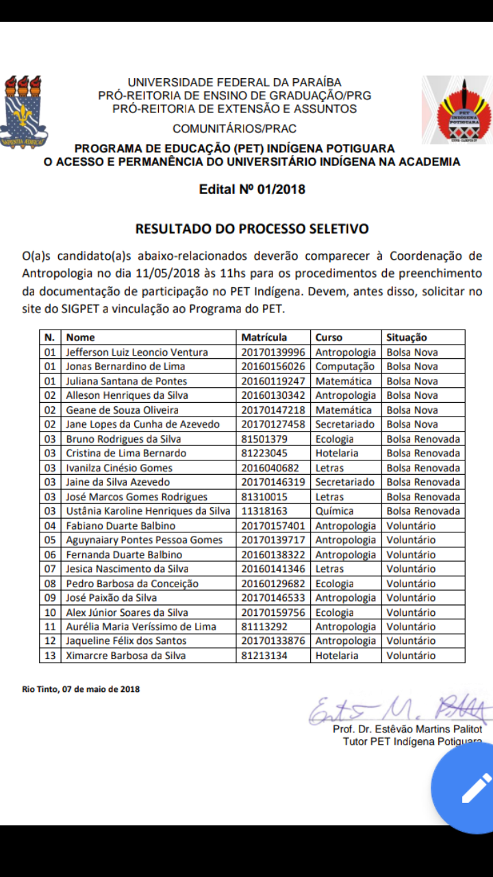 RESULTADO DA SELEÇÃO DO PET INDÍGENA.