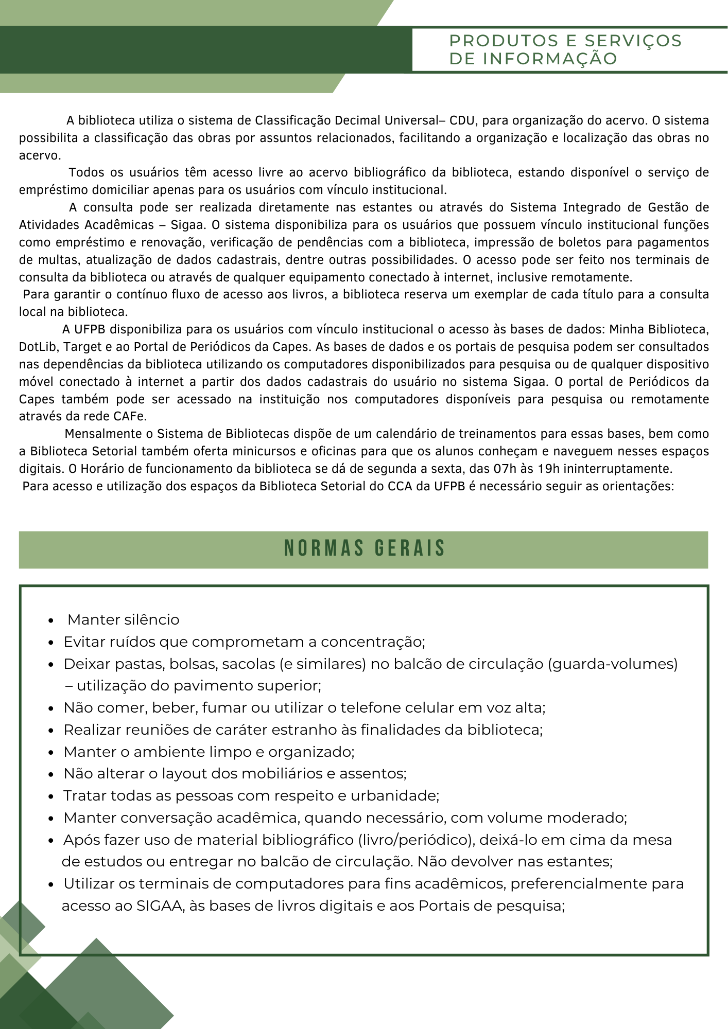 Descrição da imagem: Imagem com fundo verde claro e detalhes em verde. Título: Produtos e serviços de informação. Logo abaixo está escrito: A biblioteca utiliza o sistema de Classificação Decimal Universal– CDU, para organização do acervo. O sistema possibilita a classificação das obras por assuntos relacionados, facilitando a organização e localização das obras no acervo. Todos os usuários têm acesso livre ao acervo bibliográfico da biblioteca, estando disponível o serviço de empréstimo domiciliar apenas para os usuários com vínculo institucional. A consulta pode ser realizada diretamente nas estantes ou através do Sistema Integrado de Gestão de Atividades Acadêmicas – Sigaa. O sistema disponibiliza para os usuários que possuem vínculo institucional funções como empréstimo e renovação, verificação de pendências com a biblioteca, impressão de boletos para pagamentos de multas, atualização de dados cadastrais, dentre outras possibilidades. O acesso pode ser feito nos terminais de consulta da biblioteca ou através de qualquer equipamento conectado à internet, inclusive remotamente. Para garantir o contínuo fluxo de acesso aos livros, a biblioteca reserva um exemplar de cada título para a consulta local na biblioteca. A UFPB disponibiliza para os usuários com vínculo institucional o acesso às bases de dados: Minha Biblioteca, DotLib, Target e ao Portal de Periódicos da Capes. As bases de dados e os portais de pesquisa podem ser consultados nas dependências da biblioteca utilizando os computadores disponibilizados para pesquisa ou de qualquer dispositivo móvel conectado à internet a partir dos dados cadastrais do usuário no sistema Sigaa. O portal de Periódicos da Capes também pode ser acessado na instituição nos computadores disponíveis para pesquisa ou remotamente através da rede CAFe. Mensalmente o Sistema de Bibliotecas dispõe de um calendário de treinamentos para essas bases, bem como a Biblioteca Setorial também oferta minicursos e oficinas para que os alunos conheçam e naveguem nesses espaços digitais. O Horário de funcionamento da biblioteca se dá de segunda a sexta, das 07h às 19h ininterruptamente. Para acesso e utilização dos espaços da Biblioteca Setorial do CCA da UFPB é necessário seguir as orientações: Normas gerais: Manter silêncio; Evitar ruídos que comprometam a concentração; Deixar pastas, bolsas, sacolas (e similares) no balcão de circulação (guarda-volumes) – utilização do pavimento superior; Não comer, beber, fumar ou utilizar o telefone celular em voz alta; Realizar reuniões de caráter estranho às finalidades da biblioteca; Manter o ambiente limpo e organizado; Não alterar o layout dos mobiliários e assentos; Tratar todas as pessoas com respeito e urbanidade; Manter conversação acadêmica, quando necessário, com volume moderado; Após fazer uso de material bibliográfico (livro/periódico), deixá-lo em cima da mesa de estudos ou entregar no balcão de circulação. Não devolver nas estantes; Utilizar os terminais de computadores para fins acadêmicos, preferencialmente para acesso ao SIGAA, às bases de livros digitais e aos Portais de pesquisa.
