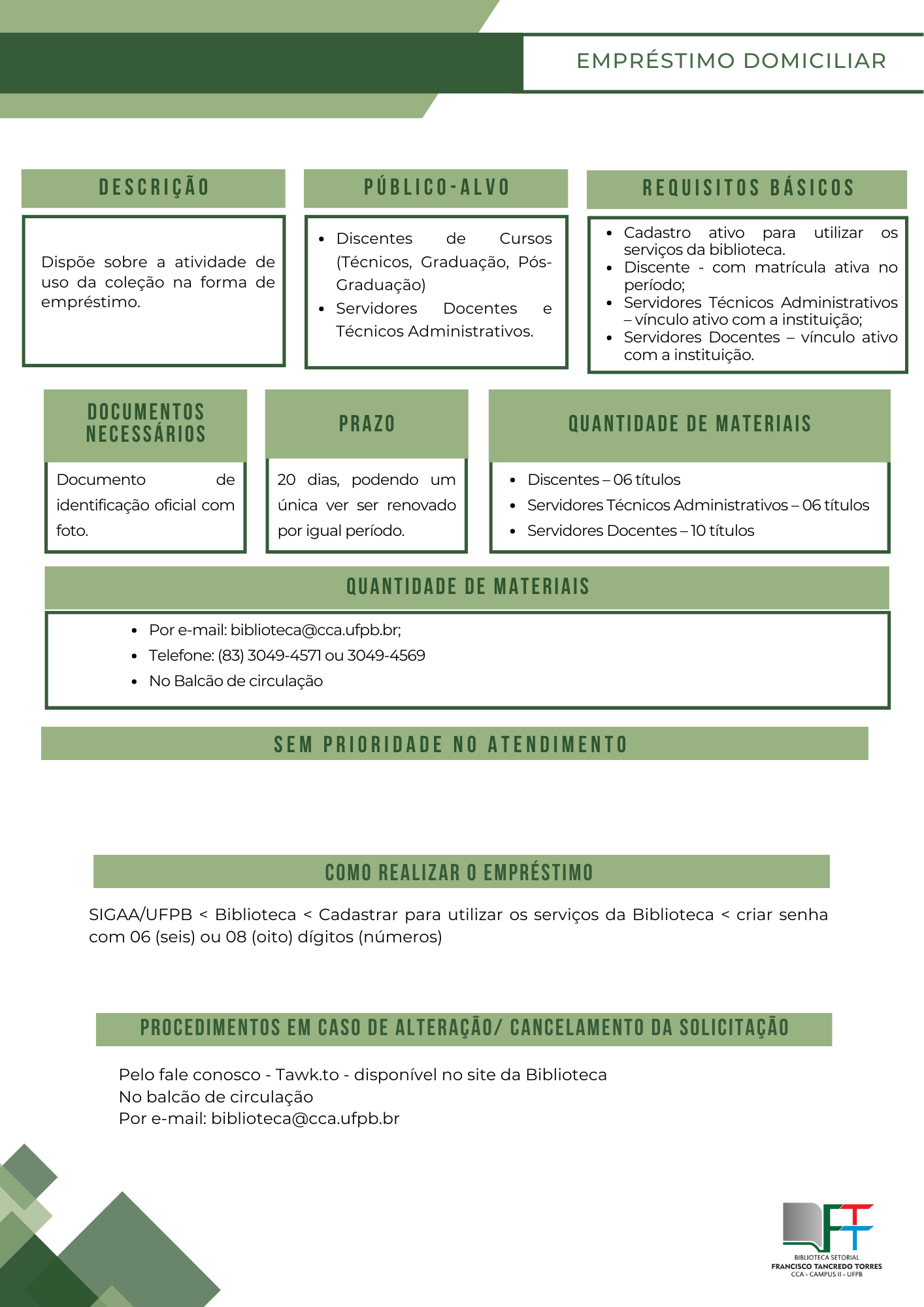 Descrição da imagem: Imagem com fundo branco e detalhes em verde claro e verde escuro. Título: Empréstimo Domiciliar. Logo abaixo se encontram quadros com as seguintes informações: descrição - Dispõe sobre a atividade de uso da coleção na forma de empréstimo. Público-alvo: Discentes de Cursos (Técnicos, Graduação, Pós- Graduação), Servidores, Docentes e Técnicos Administrativos. Requisitos básicos: Cadastro ativo para utilizar os serviços da biblioteca, Discente - com matrícula ativa no período, Servidores Técnicos Administrativos - vínculo ativo com a instituição, Servidores Docentes - vínculo ativo com a instituição. Documentos necessários: Documento de identificação oficial com foto. Prazo: 20 dias, podendo uma única vez ser renovado por igual período. Quantidade de materiais: Discentes - 06 títulos, Servidores Técnicos Administrativos - 06 títulos, Servidores Docentes - 10 títulos. Locais e formas de comunicação: Por e-mail: biblioteca@cca.ufpb.br; Telefone: (83) 3049-4571 ou 3049-4569; e no balcão de circulação. Logo abaixo está escrito: Sem prioridade no atendimento. Como realizar o empréstimo: SIGAA/UFPB ≤ Biblioteca < Cadastrar para utilizar os serviços da Biblioteca < criar senha com 06 (seis) ou 08 (oito) dígitos (números). Procedimentos em caso de alteração/ cancelamento da solicitação: Pelo fale conosco - Tawk.to - disponível no site da Biblioteca, no balcão de circulação e por e-mail: biblioteca@cca.ufpb.br. No rodapé está a logo da biblioteca setorial Francisco Tancredo Torres.