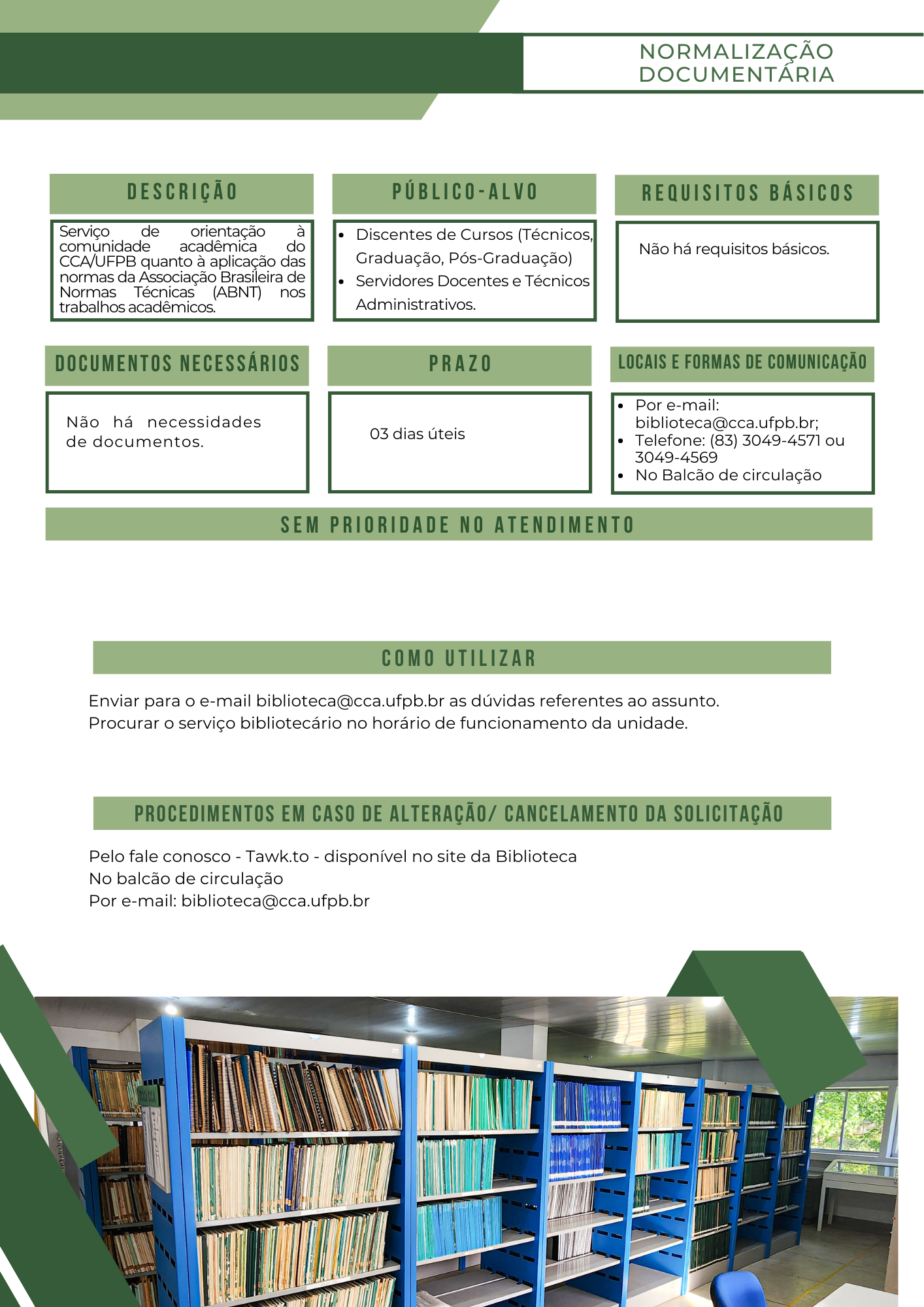 Descrição da imagem: Imagem com fundo branco de detalhes verde claro e verde escuro. Título: Normalização documentária. Logo abaixo quadros com as seguintes informações: Descrição - serviço de orientação à comunidade acadêmica do CCA/UFPB quanto à aplicação das normas da Associação Brasileira de Normas Técnicas (ABNT) nos trabalhos acadêmicos. Público alvo - discentes de cursos (técnicos, graduação, pós- graduação), servidores, docentes e técnicos administrativos. Requisitos básicos - não há requisitos básicos. Documentos necessários - não há necessidade de documentos. Prazo - 03 dias úteis. Locais e formas de comunicação: Por e-mail: biblioteca@cca.ufpb.br; Telefone: (83) 3049-4571 ou 3049-4569; e no balcão de circulação. Logo abaixo está escrito: sem prioridade no atendimento. Como utilizar - enviar para o e-mail biblioteca@cca.ufpb.br as dúvidas referentes ao assunto, procurar o serviço bibliotecário no horário de funcionamento da unidade. Procedimentos em caso de alteração/ cancelamento da solicitação: Pelo fale conosco - Tawk.to - disponível no site da Biblioteca, no balcão de circulação e por e-mail: biblioteca@cca.ufpb.br. No rodapé está uma foto das estantes de livros da biblioteca.