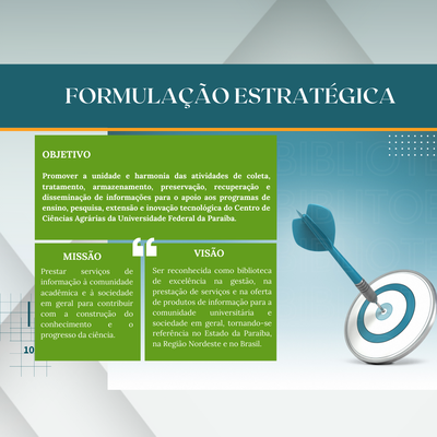 Em 2022, procurando se estabelecer como unidade de informação preocupada com a gestão de seus produtos e serviços, a Biblioteca Francisco Tancredo Torres aprovou a sua formulação estratégica que servirá de alicerce e horizonte para o desenvolvimento das ações, produtos e serviços oferecidos. É o esforço da Biblioteca de alinhamento com o futuro dos serviços e com a Universidade Federal da Paraíba e o Sistema de Bibliotecas.
