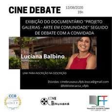 Na última quarta-feira, dia 12 de agosto de 2020, ocorreu o I Cine Debate. A ação foi desenvolvida pelos membros do Projeto de Extensão Cine Bruxaxá, em parceria com a Biblioteca Setorial do Centro de Ciências Agrárias (BSCCA), da Universidade Federal da Paraíba (UFPB). O Cine Debate busca promover encontros virtuais entre as pessoas e, ao mesmo tempo, aproximá-las das experiências que vivenciam e produzem em sociedade. Através da exibição on-line de curtas metragens, seguido de debate, a pessoa convidada compartilha seu relato de experiência ou vínculo com o tema proposto pelo curta exibido.