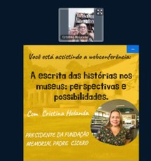 Com o título “A escrita das histórias nos museus: perspectivas e possibilidades”, a palestrante deu uma aula aos ouvintes, séria, com bom humor, tecendo reflexões sobre estes espaços, a quem servem, o que deve ser exposto, quem ditou e dita o que se expõe nos mesmos, e os desafios em atender o público na pandemia. Disse nunca ter falado para um público tão amplo, tendo em vista que estas web conferências têm alcançado pessoas de todo o Brasil. Explicou aos ouvintes que o tema da palestra surgiu depois de conversa com a coordenadora do projeto, Juccia Nathielle.