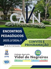 O Colégio Agrícola Vidal de Negreiros (CAVN), Campus III da Universidade Federal da Paraíba (UFPB), realizará os Encontros Pedagógicos 2025.2/2026.1 nos dias 03, 05, 10 e 11 de fevereiro, reunindo docentes e técnicos administrativos em educação envolvidos nas atividades de ensino da instituição