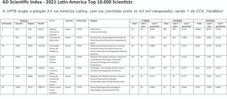 CCA tem sete cientistas ranqueados no “AD Scientific Index - 2021 Latin America Top 10.000 Scientists”