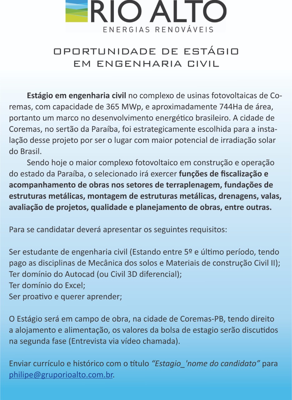 Enviar currículo e histórico com o título “Estágio_'nome do candidato” para philipe@gruporioalto.com.br.