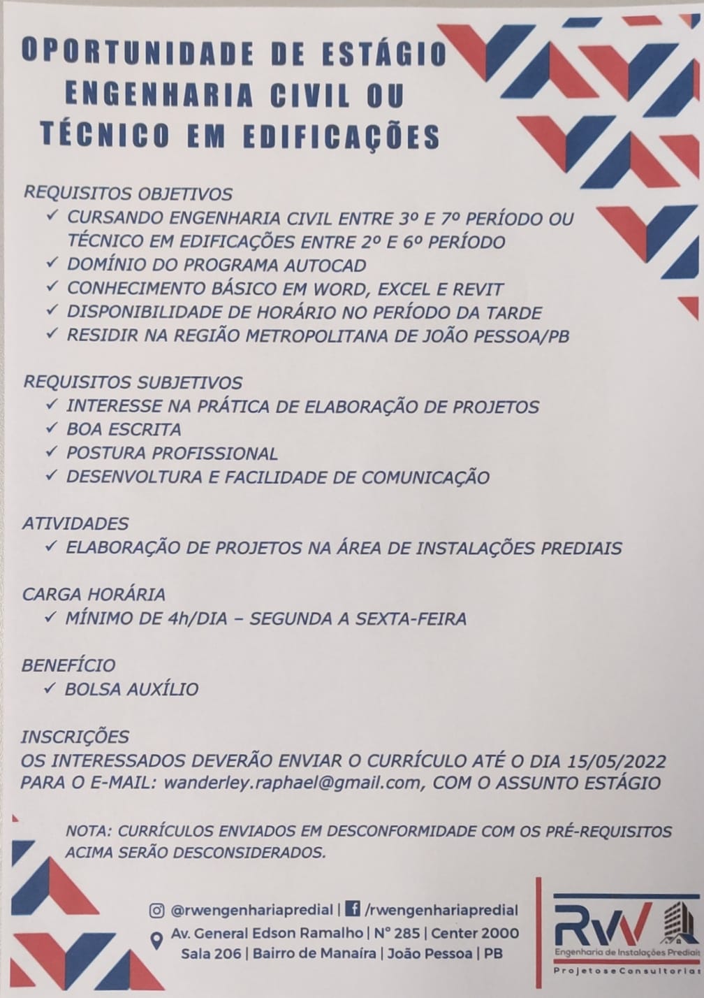 Notícias Oportunidade de estágio RW Engenharia predial Tweet publicado: 11/05/2022 15h48, última modificação: 11/05/2022 15h48