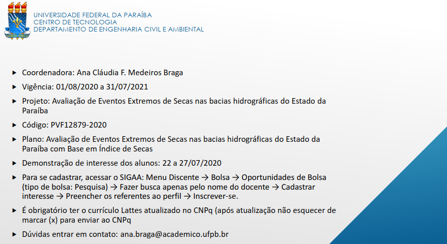- Avaliação de eventos externos de secas nas bacias hidrográficas do Estado da Paraíba com bases em índices de secas. Profª. Ana Cláudia