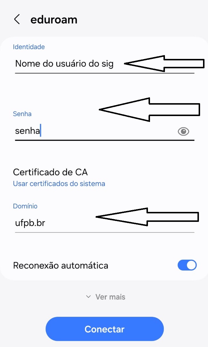 Selecione a rede: eduroam. Selecione Método EAP: PEAP. Autenticação de Fase 2: MSCHAPV2. *Certificado CA: Usar Certificados do Sistema. *Domínio: ufpb.br Identidade: seu usuário do sistema SIGAA / SIGRH. Identidade anônima: deixe em branco. Senha: senha do sistema SIGAA / SIGRH. |