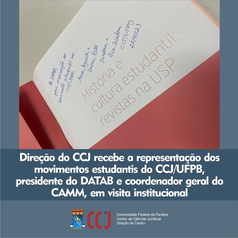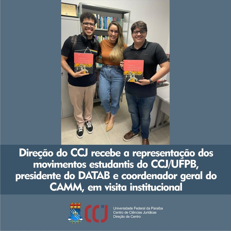 No dia 23/10/2023 a direção do CCJ/UFPB, professora Anne Augusta Alencar Leite. recebeu as visitas institucionais do presidente do DATAB e do coordenador geral do CAMM.