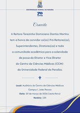 A Reitora Terezinha Domiciano Dantas Martins tem a honra de convidar os(as) Pró-Reitores (as), Superintendentes, Diretores (as) e toda a comunidade acadêmica para a solenidade de posse do Diretor e Vice-Diretor do Centro de Ciências Médicas (CCM) da Universidade Federal da Paraíba, a realizar-se no Auditório do CCM, no dia 20 de março de 2026, as 15:00.