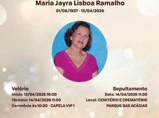 Informamos que o velório está sendo realizado no Cemitério Parque das Acácias, onde ocorrerá o sepultamento amanhã, dia 14 de abril de 2026.