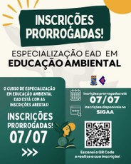 A Coordenação da Especialização em Educação Ambiental informa que o prazo de inscrição foi prorrogado até o dia 07 de julho de 2025. A medida visa oferecer mais tempo para que interessadas e interessados possam reunir a documentação exigida e concluir o processo de inscrição.