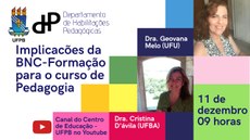 O painel “Implicações da BNC - Formação para o Curso de Pedagogia” é uma iniciativa dos docentes do Departamento de Habilitações Pedagógicas aberta à participação da comunidade acadêmica da UFPB interessada pela discussão do tema. As painelistas convidadas são as professoras Dra. Geovana Melo (UFU) e Dra. Cristina D’ávila (UFBA), que farão a apresentação e a análise de aspectos relevantes e centrais sobre a BNC - Formação e suas implicações para o Curso de Pedagogia e para a formação de professores da Educação Básica. Os participantes do painel acompanharão e participarão do debate por meio do link da transmissão ao vivo, no Canal do Centro de Educação – UFPB no YouTube, no dia 11 de dezembro às 9h.