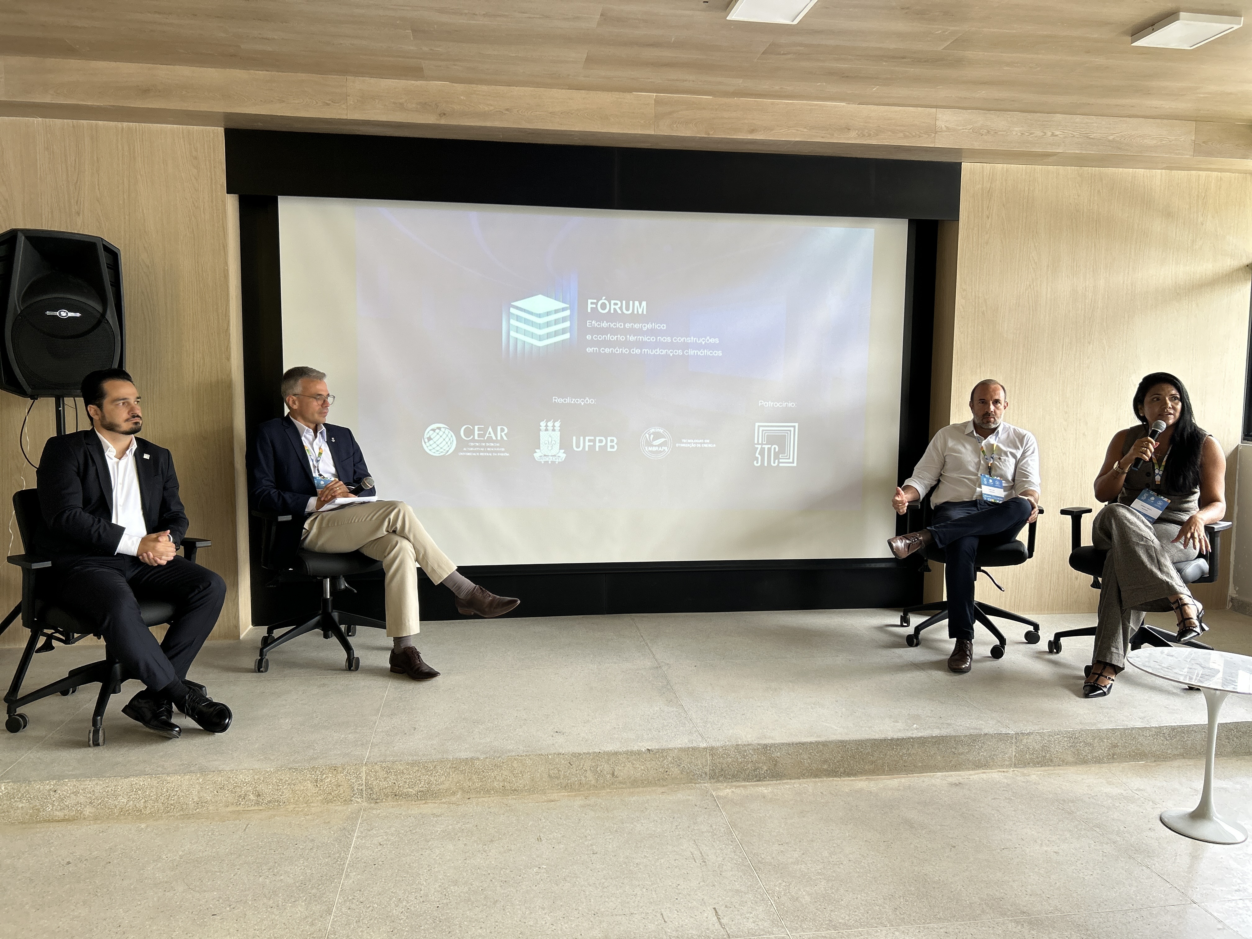 O Fórum, que teve a presença de discentes, docentes, técnicos e profissionais interessados no tema, contou com apresentações realizadas por três palestrantes – Ricardo Valentini, CEO na 3TC Isolamento e especialista em Negócios Internacionais e Engenharia de Produção; a engenheira civil Emmanuelle Mesquita, CEO da Meca Construções e fundadora da Ecotijolo; e o professor doutor em Engenharia Mecânica do CEAR Marçal Rosas.