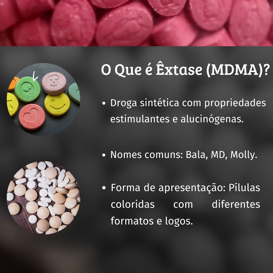 Atenção! Você sabe os riscos do uso de êxtase? O êxtase, também conhecido como MDMA, é uma substância que pode causar efeitos colaterais graves, como: