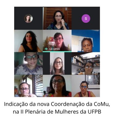 Com os objetivos de aprovar o Relatório de Gestão 2018-2020 e indicar a nova coordenação da CoMu, conforme previsto na Resolução 26/2018, foi realizada a II Plenária de Mulheres da UFPB, em 27 de novembro. Devido à pandemia da Covid-19, a plenária foi totalmente virtual e registrou a inscrição de 135 mulheres, sendo 61% discentes, 28% docentes e 11% servidoras técnica-administrativas.