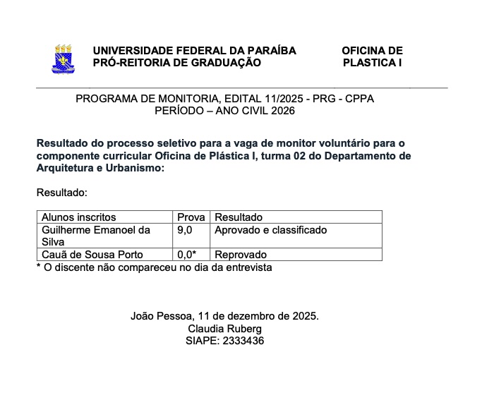 Notícias Resultado Monitoria - Oficina de Plástica I Tweet publicado: 15/12/2025 10h39, última modificação: 15/12/2025 10h39