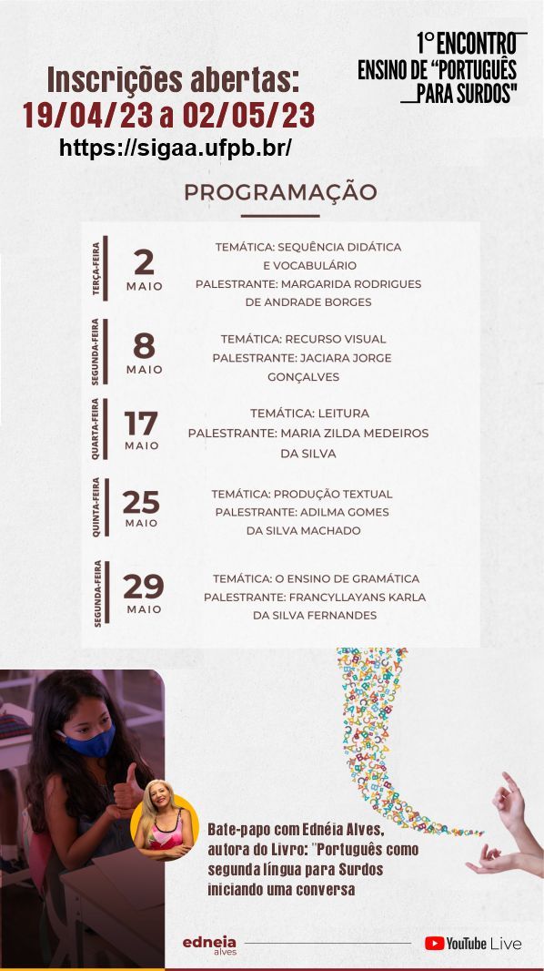 Notícias EVENTO 1º ENCONTRO ENSINO DE "PORTUGUÊS" PARA SURDOS Tweet publicado: 25/04/2023 11h04, última modificação: 25/04/2023 11h10 Exibir carrossel de imagens CALENDÁRIO DO EVENTO TUTORIAL DE REGISTRO