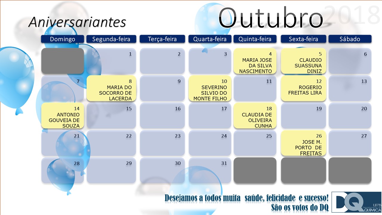O Departamento de Química parabeniza os servidores que comemoram aniversário no mês de outubro.