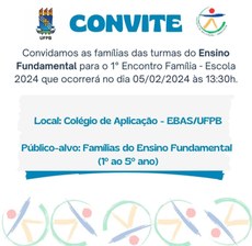 Convidamos as famílias das turmas do Ensino Fundamental (1º ao 5º ano)para o 1º Encontro Família - Escola 2024, que ocorrerá no dia 05/02/2024 às 13:30h no Colégio de Aplicação - EBAS/UFPB