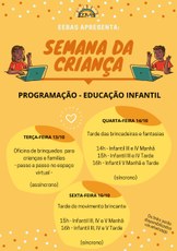 Olá turminhas!!!! Já estamos divulgando a programação da semana da criança. Esperamos a participação de todos e todas. Marque na sua agenda, o dia e a hora que estaremos em atividade festiva. Abra a programação e já deixe tudo pronto para as oficinas e brincadeiras.