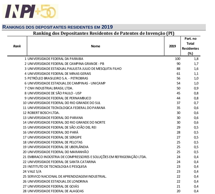 A Diretoria de Propriedade Intelectual da INOVA dedicou esforços consideráveis tanto na captação das novas tecnologias criadas pelos pesquisadores da UFPB, como na promoção de trabalho incansável em termos de correções, análises, revisões, redações e depósitos dos pedidos de patentes da UFPB. A UFPB passou de 4ª colocada em 2018 (Ranking das proteções de 2017*) para o topo em 2018! Para o Prof. Dr. Petrônio Filgueiras de Athayde Filho "a manutenção da primeira posição revela o quão dedicada é a equipe da INOVA". Ele destaca ainda que "a nossa equipe é compacta, mas muito competente e faz tudo com muita satisfação, com um olhar no futuro sustentável da nossa Instituição". Para se ter uma ideia, a Petrobrás ficou na quinta colocação a frente da UNICAMP (6ª) e da USP (8ª).