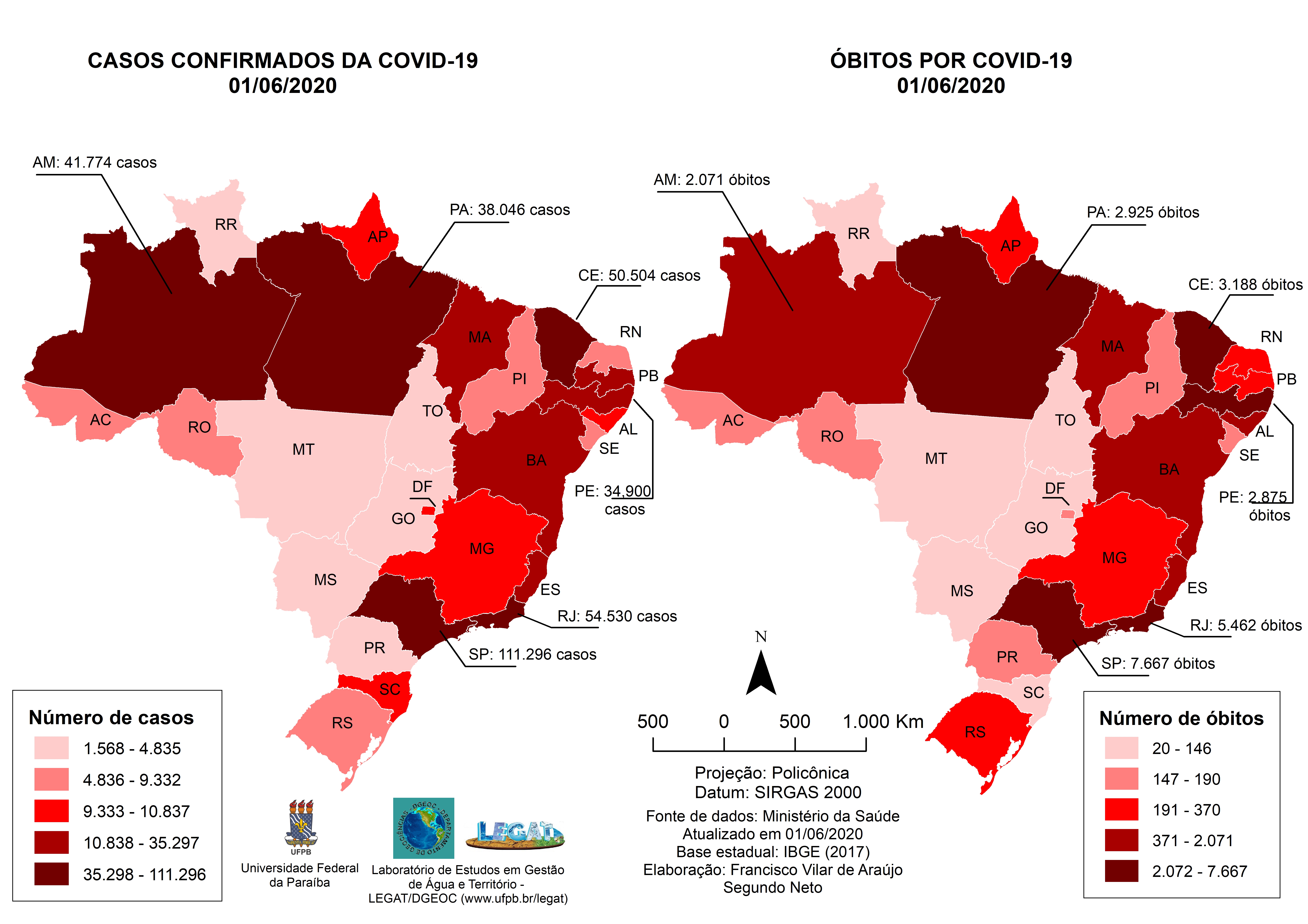 Casos confirmados e óbitos por COVID-19 no Brasil (01/06/2020).