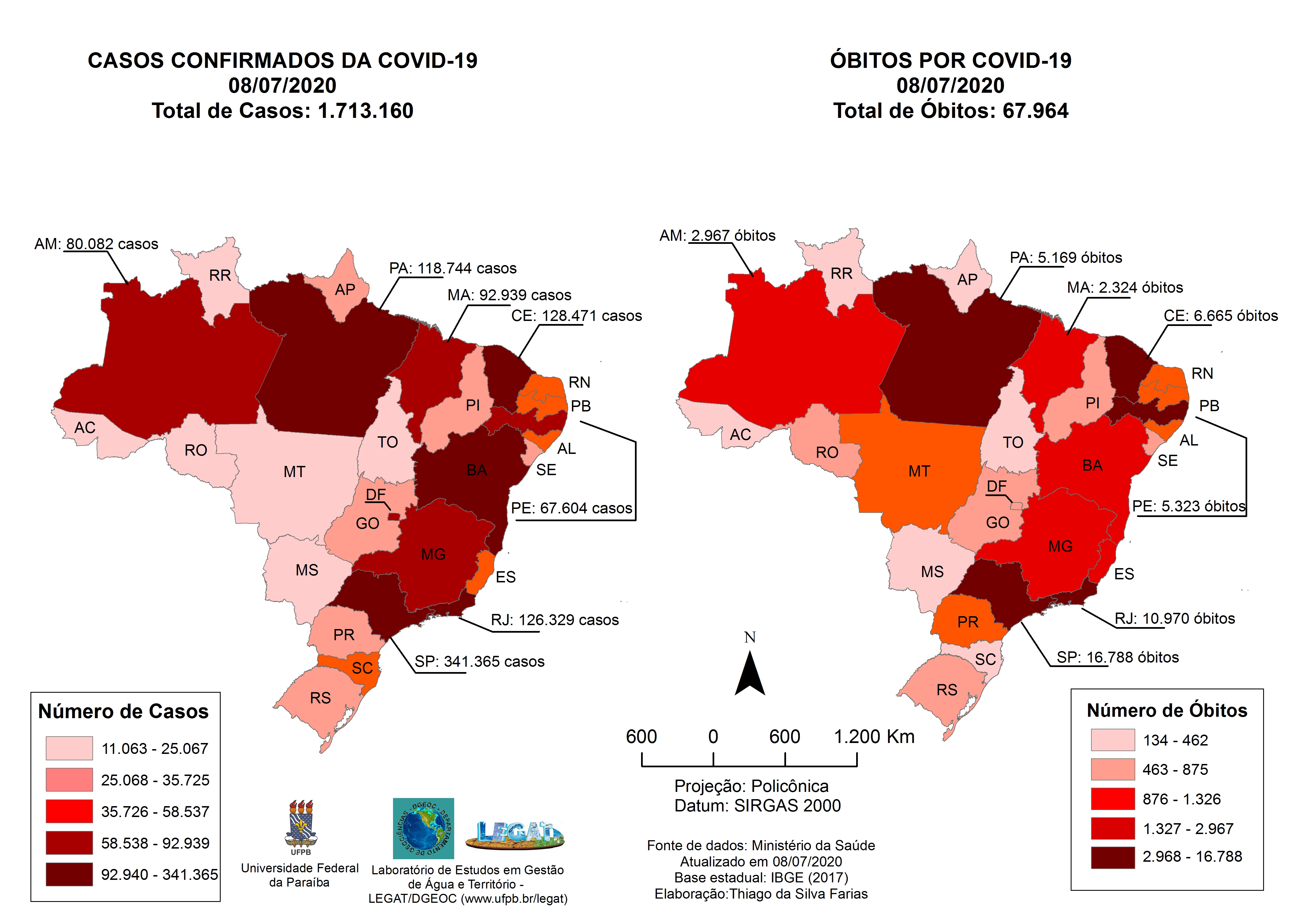 Casos confirmados e óbitos por COVID-19 no Brasil (08/07/2020).