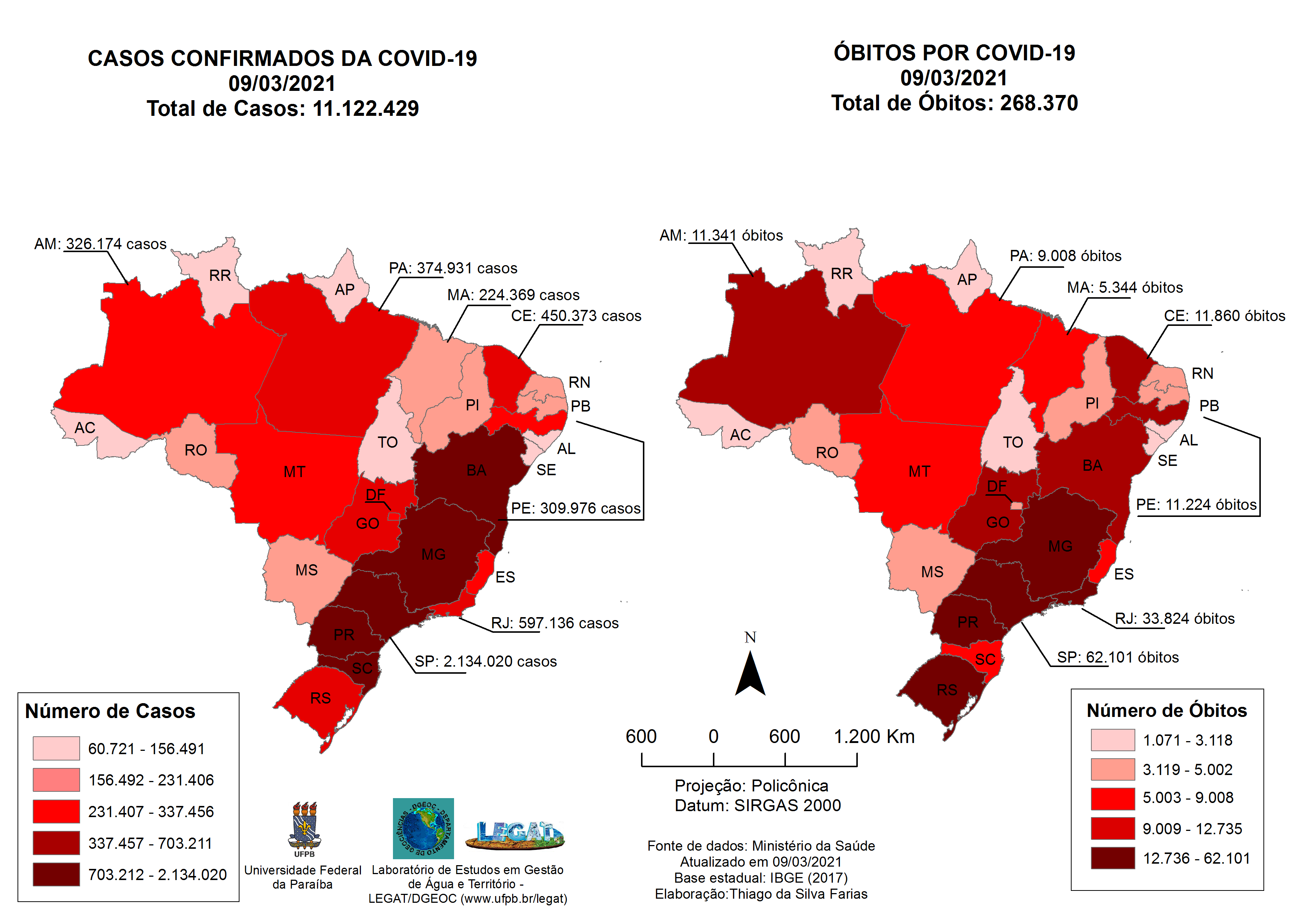 Casos confirmados e óbitos por COVID-19 no Brasil (09/03/2021).