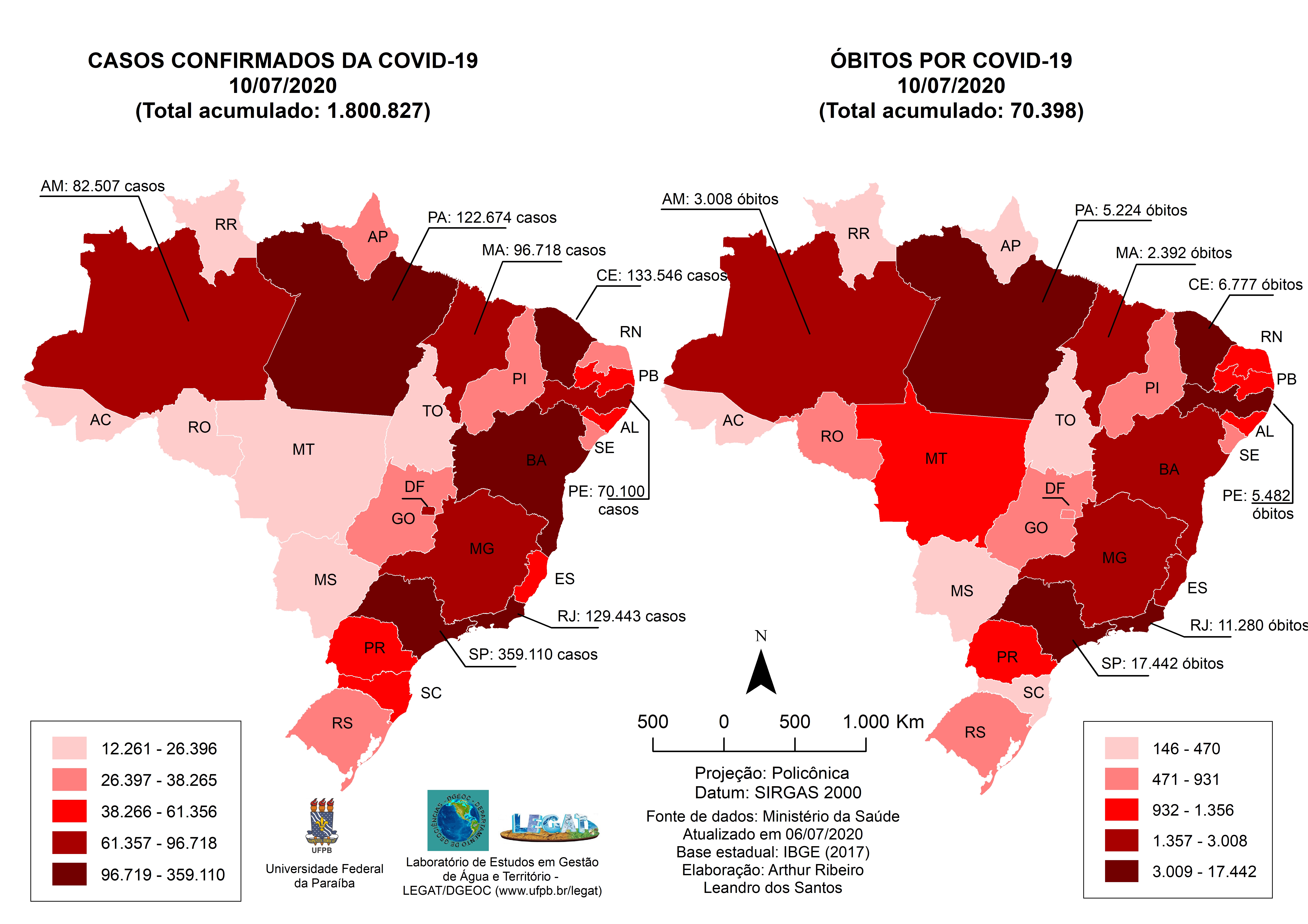 Casos confirmados e óbitos por COVID-19 no Brasil (10/07/2020).