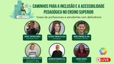 #Pracegover: Card com fundo verde com os convidados para o Webinário "Caminhos para a Inclusão e Acessibilidade Pedagógica no Ensino Superior: vozes de profissionais e estudantes com deficiência". O nome vem ao lado da ilustração de um cadeirante que usa capelo e segura um diploma. A cadeira de rodas está sobre um grande livro, ladeado por folhagens. Atrás, os tomos de dois outros livros junto a uma grande engrenagem, além de um aviãozinho de papel.