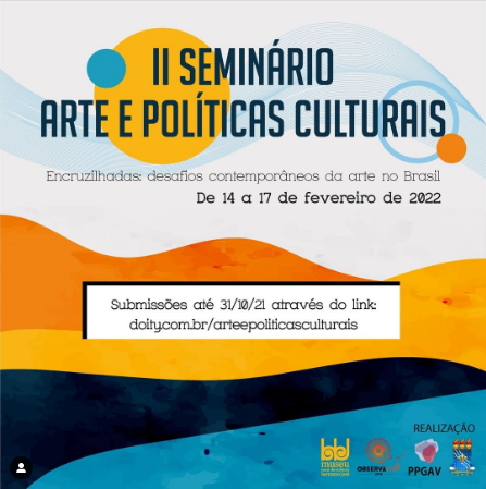 O II Seminário Arte e Políticas Culturais é um evento que visa debater os atuais desafios do campo das artes e da cultura no Brasil, trazendo especialistas de referência para a sua programação. O evento ocorrerá de forma virtual, entre os dias 14 e 17 de fevereiro de 2022, contando com conferências, mesa-redonda, Simpósio acadêmico e programação cultural. As inscrições seguem abertas para diferentes categorias de participação e podem ser feitas pela plataforma Doity (https://doity.com.br/arteepoliticasculturais), onde também é possível conferir a programação completa.