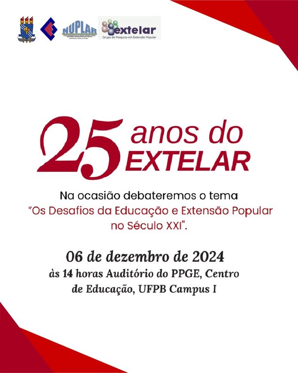 Vinculado ao NUPLAR e ao Programa de Pós-Graduação em Educação, cadastrado no Diretório de Pesquisa do CNPq, o EXTELAR completa 25 anos com debate sobre a Educação Popular no séc. XXI