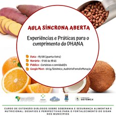 A aula será realizada no dia 19 de agosto (quarta-feira), às 17 horas, e transmitida virtualmente, por meio do Google Meet, podendo ser acessada através do seguinte link: bit.ly/Sistêmica_AuditórioPontoDeMutação. Nesse momento, serão discutidas experiências e práticas locais que vêm contribuindo para o cumprimento do DHANA, a partir da atuação de diferentes atores e atrizes das organizações da sociedade civil, governamentais e Instituições de Ensino, Pesquisa e Extensão. Participarão do debate representantes da Universidade Federal de Campina Grande - UFCG/Campus Cuité, Articulação no Semiárido Brasileiro - ASA/PB e Câmara Interministerial de Segurança Alimentar e Nutricional - CAISAN Nacional.
