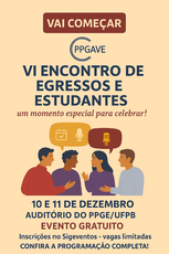 O Programa de Pós-Graduação em Políticas Públicas, Gestão e Avaliação da Educação (PPGAVE/UFPB) convida para o VI Encontro de Egressos e Estudantes, um momento especial para celebrar quem fez e quem faz parte dessa trajetória que já ultrapassa dez anos de compromisso com a educação pública.