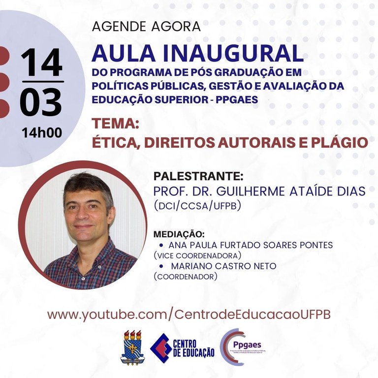 Tema da aula inaugural do Ppgaes: Ética, direitos autorais e plágio. Dia 14/03/2022 às 14h00