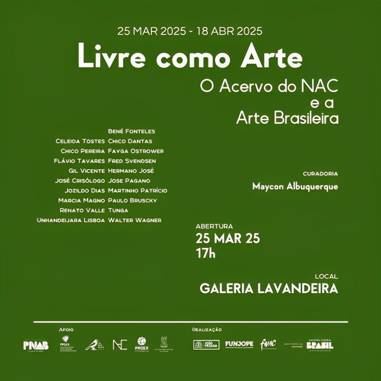 Abertura da exposição “Livre como Arte: O Acervo do NAC e a Arte Brasileira”, dia 25/3 na Galeria Lavandeira