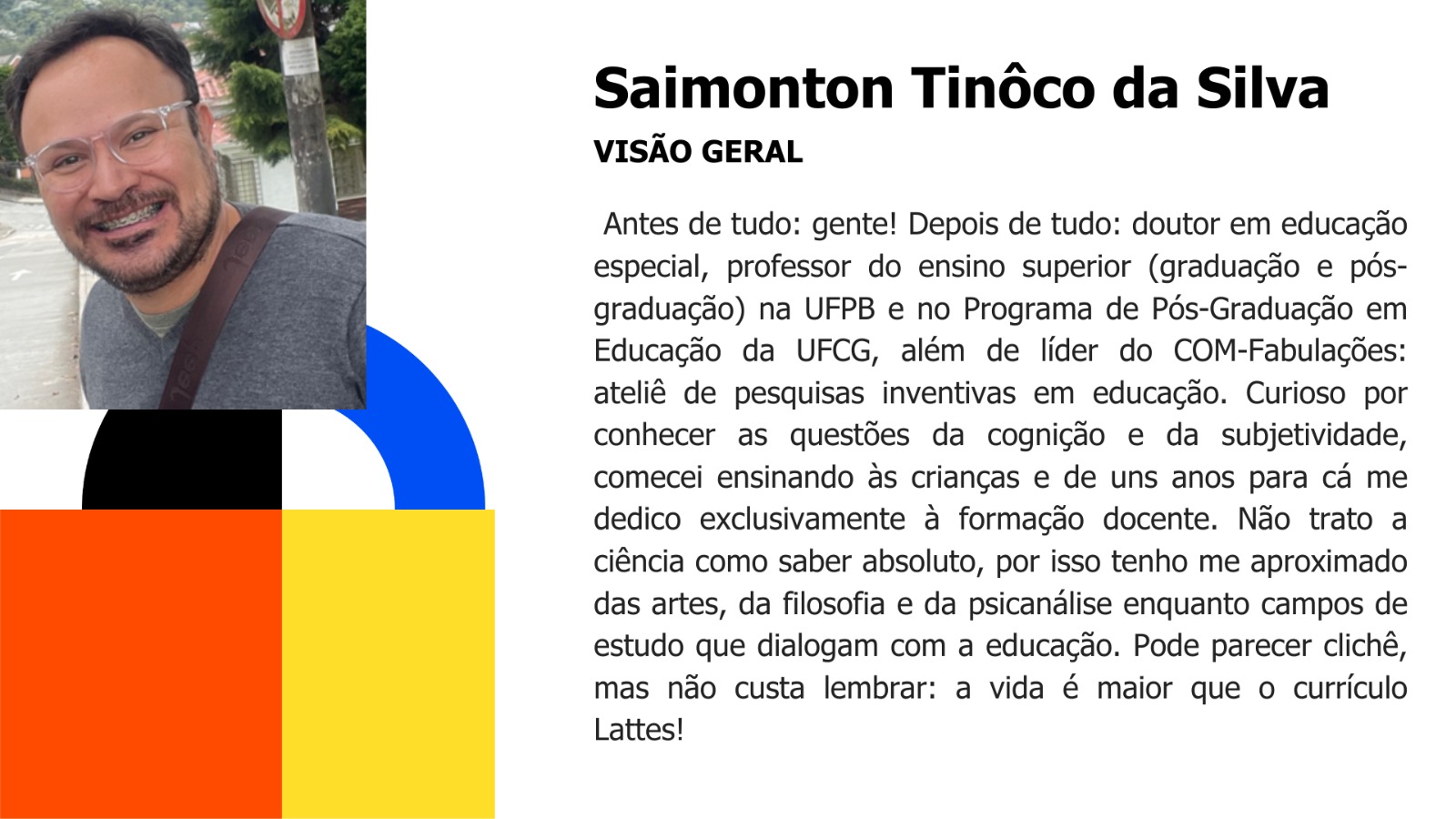 - Áreas de Interesse: Narrativas e histórias de vidas de humanos e mais-que-humanos; Histórias de vida, inclusão e teorias queers; Currículo, diferenças e poéticas da invenção com os cotidianos; Conversas e escrevivências e contracolonialidade e… e… e…; Pesquisas cartográficas e inventivas na Educação; Estudos culturais da educação; e O que nos deixa feliz… o devir… o porvir…