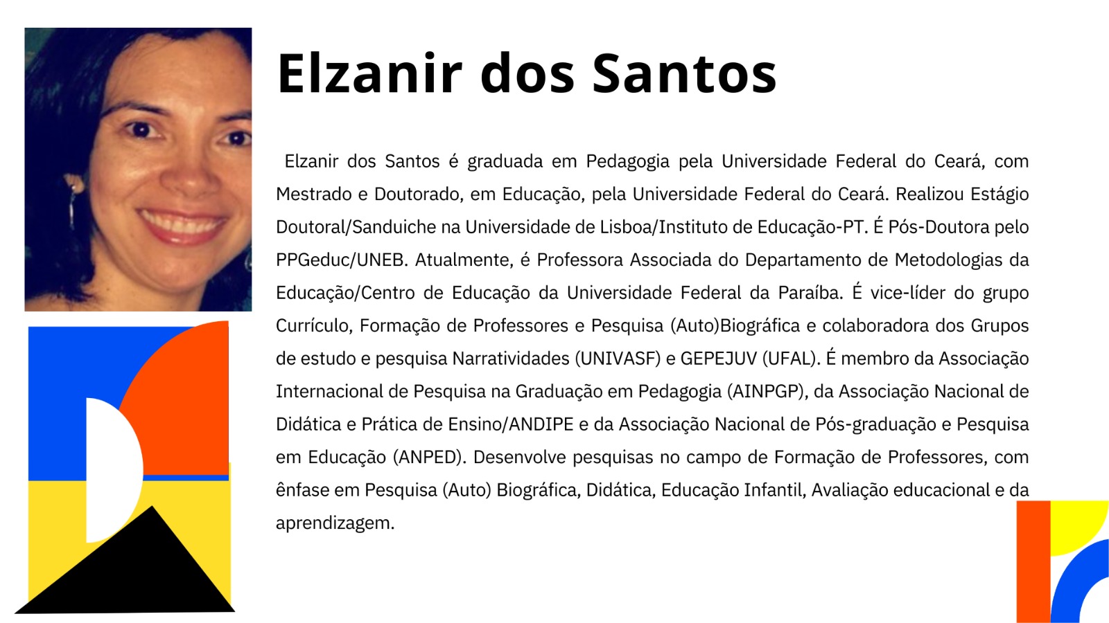 - Áreas de Interesse: Formação inicial e permanente de professores para a EJA, metodologias e práticas educativas dos movimentos sociais (campo, gênero, LGBTs e étnico-raciais) e discentes da EJA.
