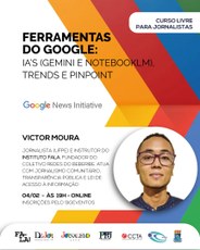 O Programa de Pós-Graduação em Jornalismo (PPJ), o Departamento de Jornalismo (DEJOR) e a Coordenação do curso de graduação em Jornalismo, todos vinculados ao Centro de Comunicação, Turismo e Artes (CCTA) da Universidade Federal da Paraíba (UFPB) realizarão no próximo dia 4 de fevereiro de 2026 (quarta-feira), às 19h, o curso livre para jornalistas “Ferramentas Google: IA’s (Gemini e NotebookLM), Trends e Pinpoint”. O curso é resultado de uma parceria com o Instituto Fala e com a Google News Initiative.