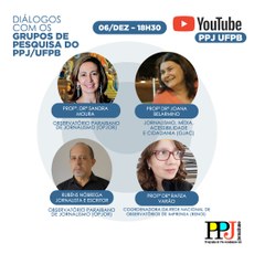 O primeiro, na segunda-feira, 6, as 18h30, é parte dos seminários “Diálogos com os Grupos de Pesquisa do PPJ/UFPB” e traz o grupo Observatório Paraibano do Jornalismo (OPJOR), com os pesquisadores Rubéns Nóbrega, Joana Belarmino, Sandra Moura, além de Rafiza Varão da Rede Nacional de Observatórios de Imprensa (Renoi).