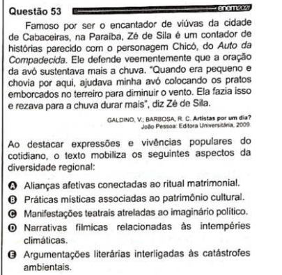 O texto mencionado na prova citava o paraibano Zé de Sila, figura conhecida na cidade de Cabaceiras, famosa por ser a Roliúde Nordestina. “Conheci seu Zé de Sila em 2008, quando produzia minha dissertação de mestrado intitulada Um lugar de produção e a produção de um lugar: relatos de experiências educativas em Cabaceiras, submetida ao Programa de Pós-graduação em Educação da UFPB. O contato com a cidade e as pessoas que compõem aquele lugar me fizeram vislumbrar vidas que se educam por meio das experiências, que – no caso de seu Zé de Sila –, construíam-se por meio da participação em filmes, como figurantes”, contou a Profa. Vivian Galdino.