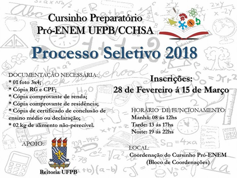 Estão abertas, até 15 de março, as inscrições para participar do curso gratuito Pró-Enem do Centro de Ciências Humanas, Sociais e Agrárias (CCHSA), localizado no campus III da Universidade Federal da Paraíba (UFPB), em Bananeiras.