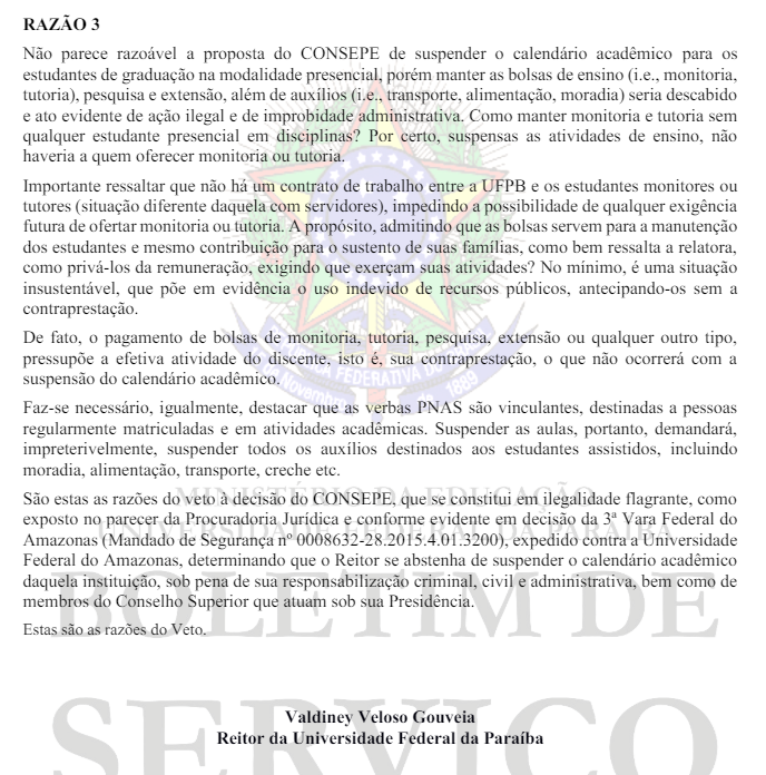 Reitor da UFPB veta decisão do Consepe que suspenderia Calendário Acadêmico do período 2024.1