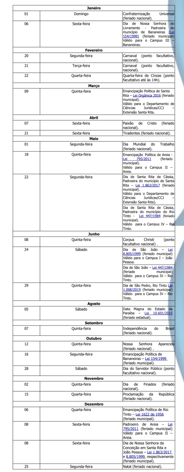 O documento, que inclui feriados em nível nacional, estadual e municipal que afetam o funcionamento de cada um dos campi (João Pessoa, Areia, Bananeiras e Rio Tinto/Mamanguape), está disponível para download na página da Progep.