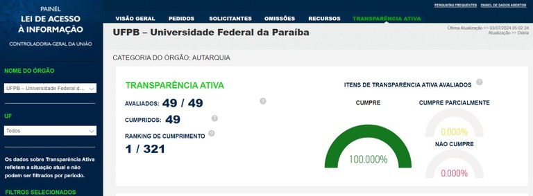 UFPB está entre órgãos e entidades que lideram painel da CGU e atendem plenamente à transparência ativa