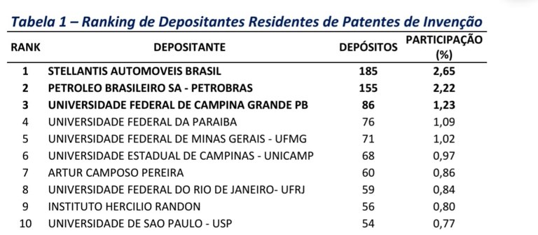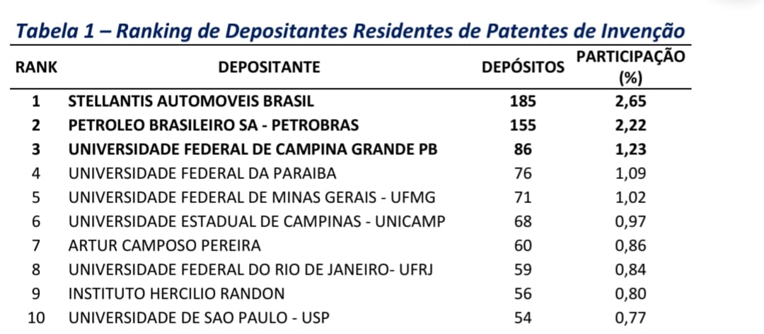 UFPB fica em quarto lugar no ranking de depositantes de patentes de invenção