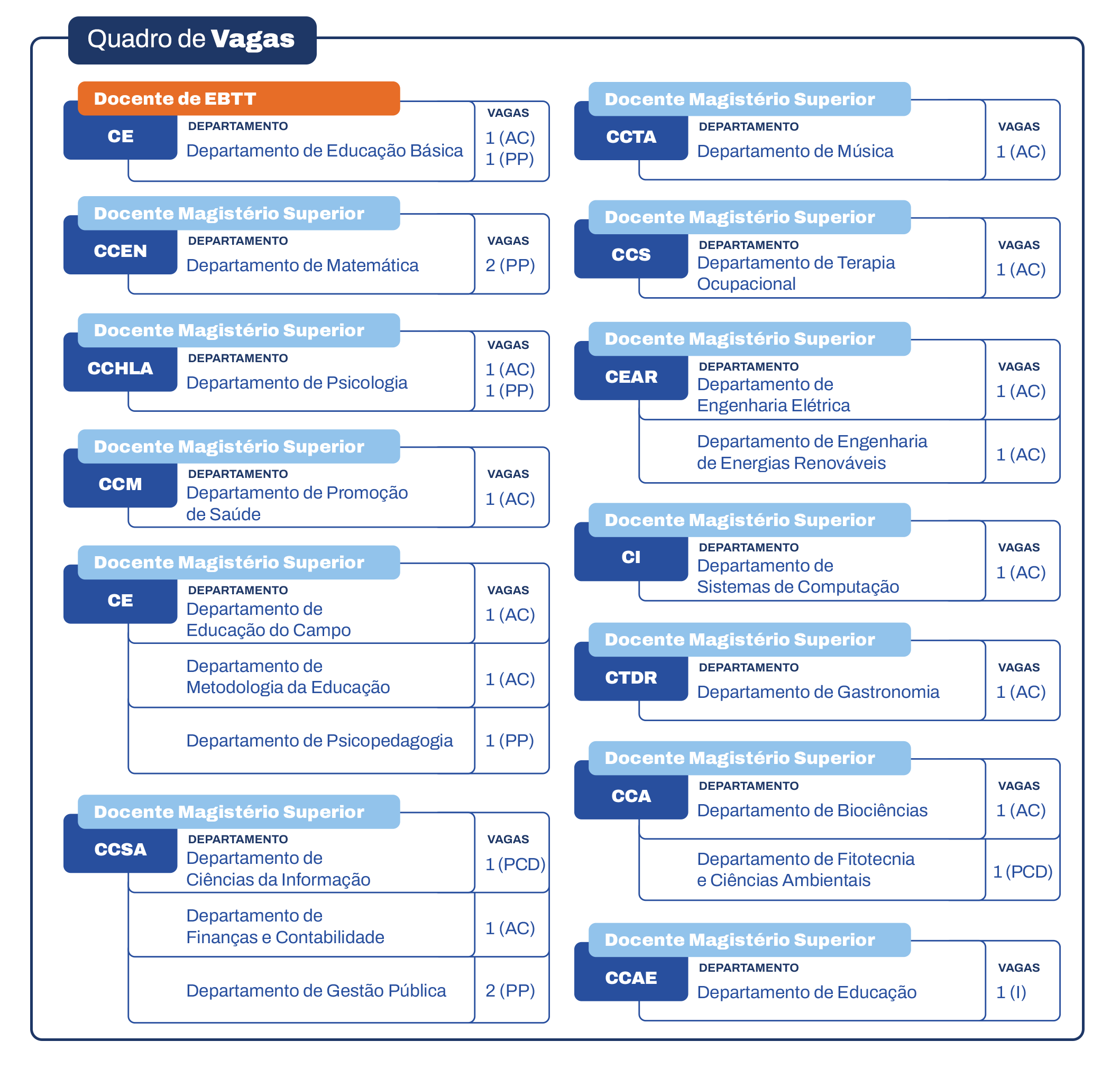 A Pró-Reitoria de Gestão de Pessoas (Progep) publicou dois editais de processos seletivos para preenchimento de 23 vagas de professor substituto na Universidade Federal da Paraíba (UFPB). No Edital Nº 100/2025, são ofertadas 21 vagas no Magistério Superior, enquanto no Edital Nº 101/2025 foram abertas duas vagas para o Ensino Básico, Técnico e Tecnológico (EBTT). Além das oportunidades para Ampla Concorrência (AC), há reserva de vagas para pessoas Pretas ou Pardas (PP), Pessoas com Deficiência (PcD) e Indígenas (I).